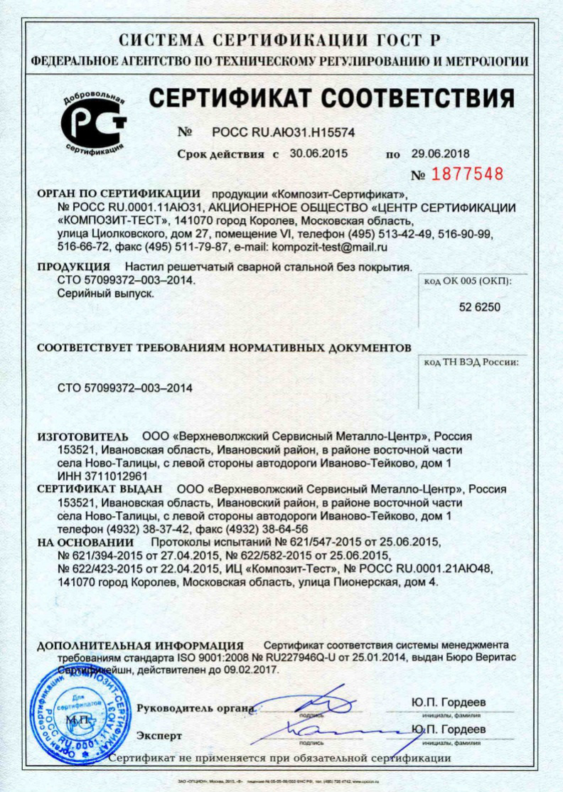 Согласно системе сертификации ГОСТ Р, сварной решетчатый настил производства ООО «Верхневолжский СМЦ» получил сертификат соответствия, который подтверждает, что продукция соответствует требованиям нормативных документов СТО 57099372-003-2014.