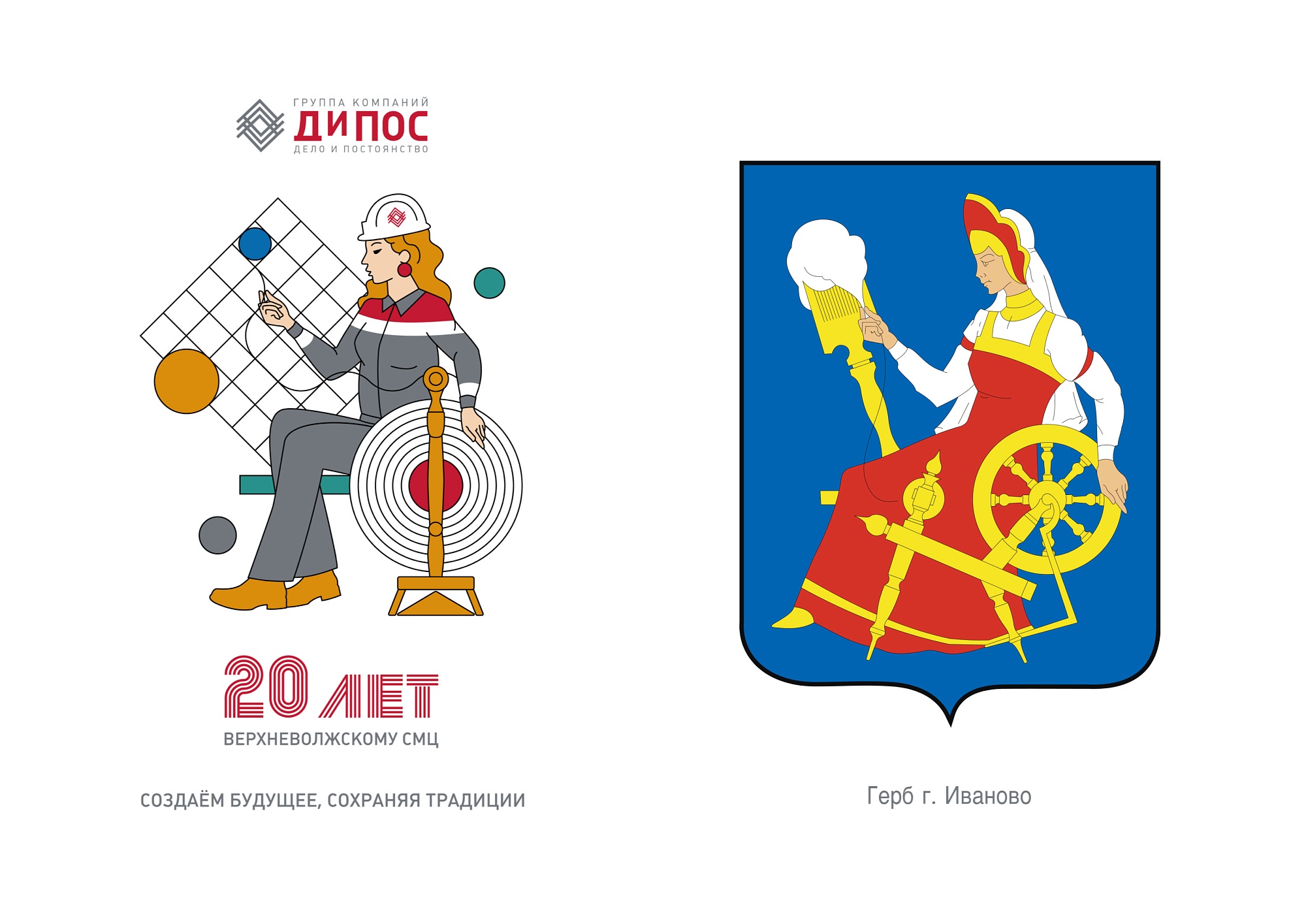 Чтобы показать географическую связь металлобрабатывающей и текстильной промышленности, мы попробовали модифицировать герб города Иваново применительно к нашей отрасли: девушка-работница создает полотно сварной сетки с помощью прялки с проволокой. Слоган «Создаем будущее, сохраняя традиции» напоминает о связи времен.