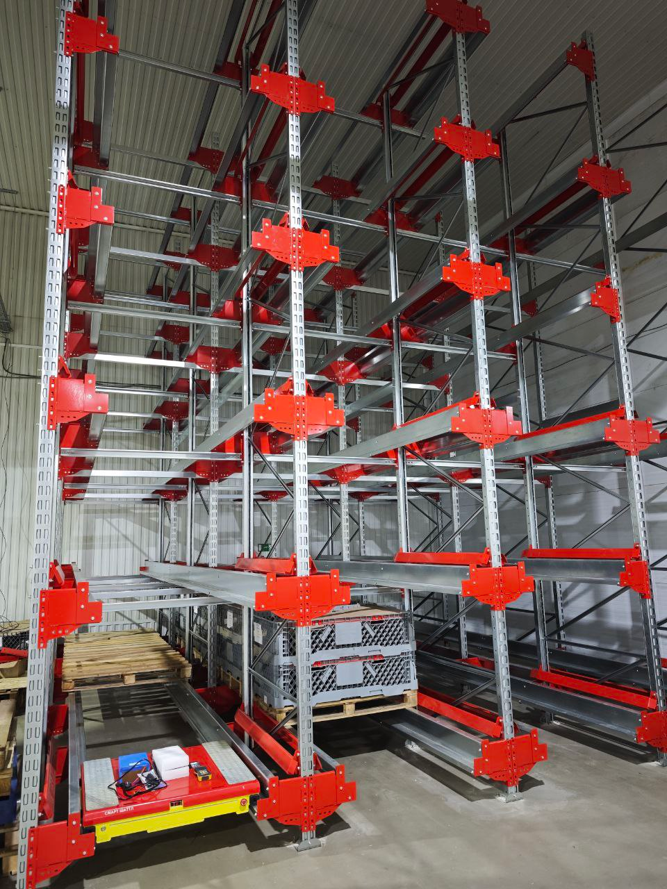 Специалистами «ДиПОС» был разработан проект стеллажных конструкций, оптимизированных под особенности склада и номенклатуру продукции заказчика - производителя продуктов питания. Стеллажи были изготовлены на производстве в городе Иваново и адаптированы под работу со смарт-шаттлом.