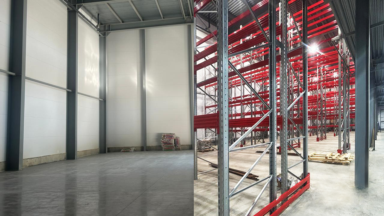 - Мезонин на фронтальных колоннах — для эффективного использования вертикального пространства и повышения общей вместимости склада.